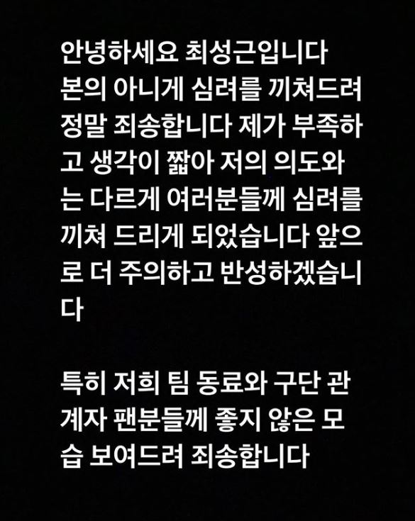최성근은 "부족하고 생각이 짧아 저의 의도와는 다르게 여러분께 심려를 끼쳐드리게 됐다"며 "앞으로 더 주의하고 반성하겠다"고 말했다. 이어 "특히 저희 팀 동료와 구단 관계자, 팬분들께 좋지 않은 모습 보여드려 죄송하다"고 사과했다.