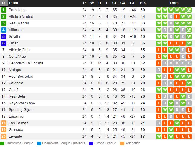 말라가는 지난 라운드 비야레알 원정에서 0-1 패배를 당하면서 리그 2연승이 중단 되었다.  지난 9월 첫 대결에서는 0-0 무승부를 거두었지만 지금의 레알의 전력은 그때 보다 훨씬 좋아진 상황이기에 어려운 경기가 예상된다. 레알마드리드는 지난 라운드 빌바오 전에서 4-2 승리를 거두고 주중 로마와의 챔스 원정에서도 2-0 승리를 만들었다. 주전 레프트백인 마르셀로가 부상에 복귀하였고 호날두가 득점에 성공하는등 공수 모두 안정감이 있는 모습을 보여주고 있다.
