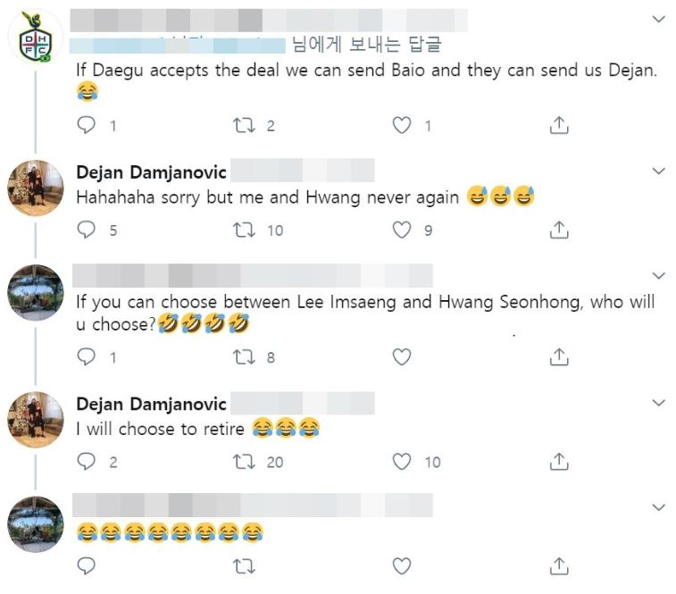 그러자 경기 후 트위터에서 대전하나시티즌 팬으로 추정되는 외국인 트위터 계정은 데얀을 향해 "우리 팀의 바이오와 데얀을 트레이드하고 싶다"라는 이야기를 꺼냈다. 그러자 데얀은 "나와 황선홍 감독은 다시는 함께 뛸 일이 없다"라고 답글을 달았다.