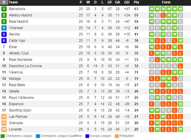 마드리드 더비이자 양팀 모두 우승을 위해서는 반드시 승리를 거둬야 하는 경기이다. 레알 마드리드는 지난 라운드 말라가 원정에서 1-1 무승부를 거두고 리그 3위에 머물러있다. 최근 7번의 홈 경기에서 전승행진을 달리고 있지만 AT 와의 경기에서는 항상 힘든 경기를 치렀던 전적이 있다. AT 마드리드는 지난 라운드 헤타페 전에서 1-0 승리를 거두고 리그 2위를 유지하고 있다. AT 마드리드도 티아고 정도를 제외하고 큰 부상자는 없지만 주중 아인트호벤과의 챔스 원정을 치루고 돌아오기 때문에 체력적으로 열세가 예상된다.