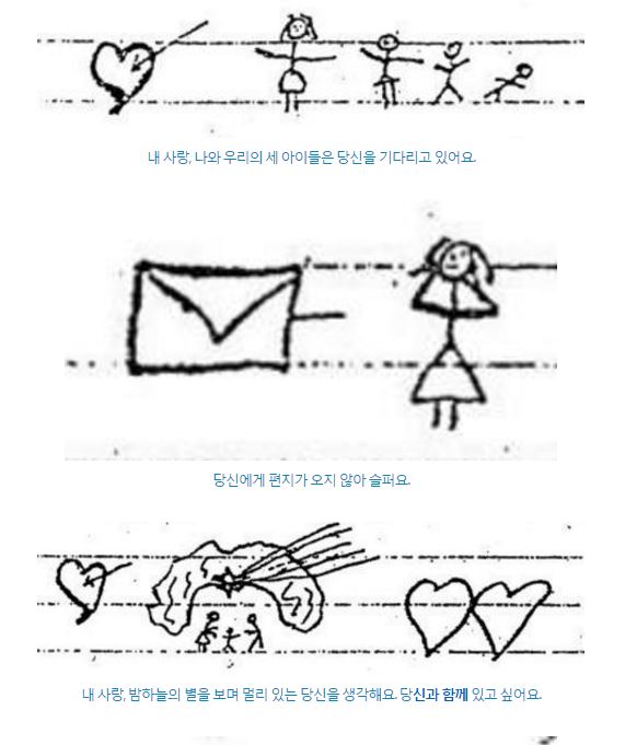 온라인 커뮤니티에 올라온 '세상에서 가장 아름다운 편지'는 70년대 이탈리아에서 '문맹'인 아내가 남편에게 보낸 그림편지이다. 당시 이탈리아는 인구의 5%정도가 문맹이었기 때문에 편지를 '그리는 일'이 종종 있었다고 한다.