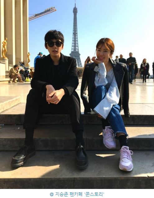 과거와 현재 사진 모두, 에펠 탑과 관광객들을 배경으로 낮은 계단에 서로를 바라보며 앉아있는 지승준 모자의 다정한 모습이 담겨있다.
