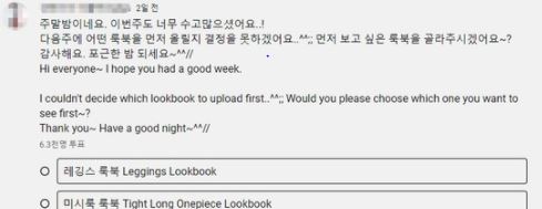 또 A씨는 이날 자신의 커뮤니티 채널에 "다음 주에 어떤 룩북을 올릴지 결정을 못 하겠다. 먼저 보고 싶은 룩북을 골라달라"고 며 '레깅스 룩북'과 '미시룩(아가씨 같은 주부들이 입는 옷) 룩북' 중 투표를 요청했다. 약 6300명이 참여한 투표 결과, 18일 기준 '미시룩 룩북'이 65%로 우세했으며 누리꾼들의 응원 댓글이 쏟아졌다.