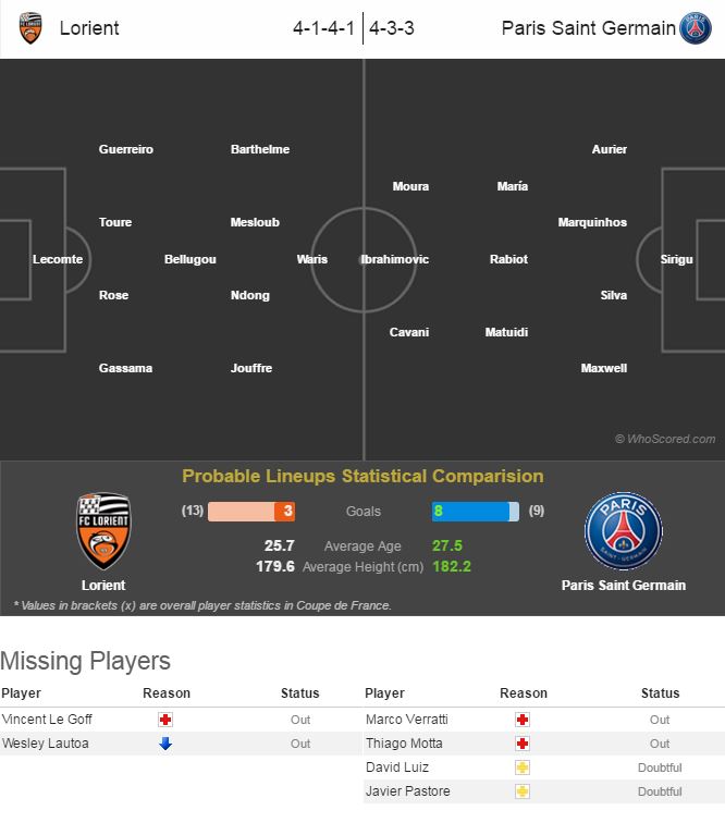 로리앙은 지난 주말 툴루즈와 홈경기서 1-1로 비겼다. 최근 5경기 성적은 1승2무2패. 리그 순위는 11위다. 애매한 포지션이라 컵대회에 대한 의지가 높을 것 같다. psg는 맨시티 원정에서 패하며 UCL 4강 진출에 실패했다. 이에 대한 분풀이라도 하듯 주말 캉전에서 6-0 대승을 이끌어냈다. FW 즐라탄이 2골을, MF 디 마리아, FW 카바니, DF 맥스웰까지 득점 작업에 가담했다. 리그 우승이 높은 상황이라 컵대회 우승을 통한 더블에 도전한다. 지난 주말 경기를 통해 경기력에 이상이 없음을 알렸다. 최근 맞대결에선 8승3무1패로 PSG가 앞선다.