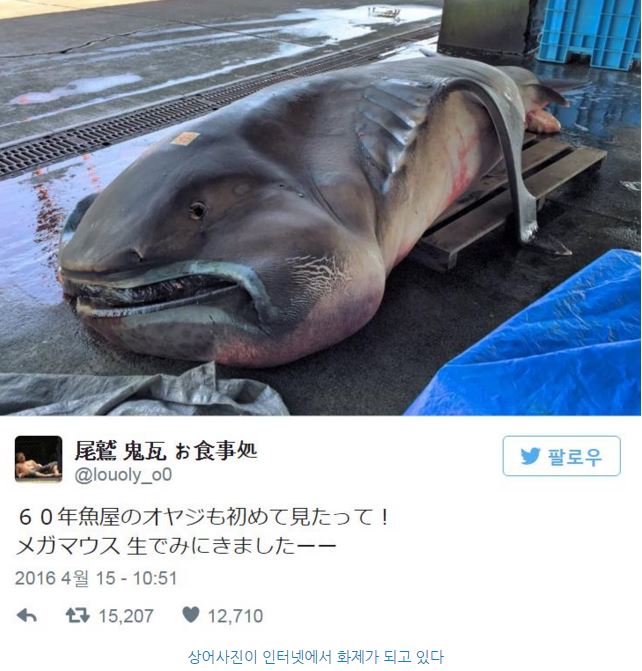 사진 속 무섭게 생긴 상어는 '메가마우스(megamouth) 상어'다. '메가 마우스' 상어는 660피트(약 200m 이하)의 심해에 사는 상어로 흔히 볼 수 없는 상어이다. 더욱이 이번에 잡힌 메가마우스 상어는 무게가 907kg, 길이는 약 5m에 달하는 것으로 밝혀져 사람들을 더욱 놀라게 하고 있다.