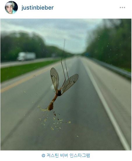 먼저 "Samsung photo"라며 자동차 앞 유리에 달라붙어있는 죽은 벌레 사진을 올렸다. 2차선 도로와 푸른 들판, 흐릿한 하늘이 배경으로 보인다.
