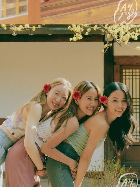 또 제주 친구들과 함께 서로 뒤에서 끌어안는 모습으로 화기애애한 분위기를 자아냈다. 세 사람은 꽃을 귀 뒤에 꽂은 채 활짝 웃고 있다. 특히 이효리의 초승달처럼 휘는 눈웃음과 입매가 돋보인다.