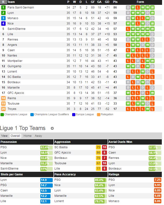 PSG 는 지난 주말 릴과의 컵 대회에서 2-1 승리를 거두고 우승을 차지 하였다. 이미 리그 우승도 확정 지은 상황지만 경기력에는 전혀 변함 없는 모습이다. 즐라탄은 올 시즌 리그에서만 32골을 넣었다. 렌은 지난 라운드 모나코 전에서 1-1 무승부를 거두고 리그 3경기 연속 승리를 기록하지 못하고 있다. 어느새 순위도 7위까지 하락 하였고 뎀벨레와 시오 등 공격진의 최근 활약도 주춤한 모습이다.