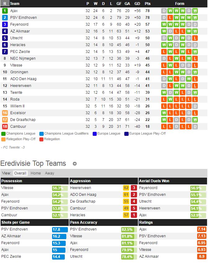아약스는 지난 라운드 헤렌벤 전에서 2-0 승리를 거두고 리그 1위를 지키고 있다. 여전히 아인트호벤과 승점이 동률이기에 남은 2경기 전승을 따내야 우승이 가능한 상황에서 밀리그-클라센 등 베스트 멤버가 전부 출전 할 것이다. 트벤테는 지난 라운드 엑셀시오르 전에서 2-0 승리를 거두고 리그 13위를 유지하고 있다. 트벤테는 올시즌 58실점이나 기록 할 정도로 수비력이 좋지 못하고 아약스의 막강 화력을 상대하기엔 쉽지 않을 것이다.