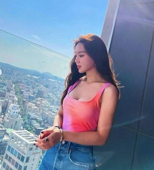 공개된 사진 속 김희정은 자주색 수영복 위에 쇼트팬츠를 입는 독특한 패션으로 패셔니스타다운 면모를 보인다.