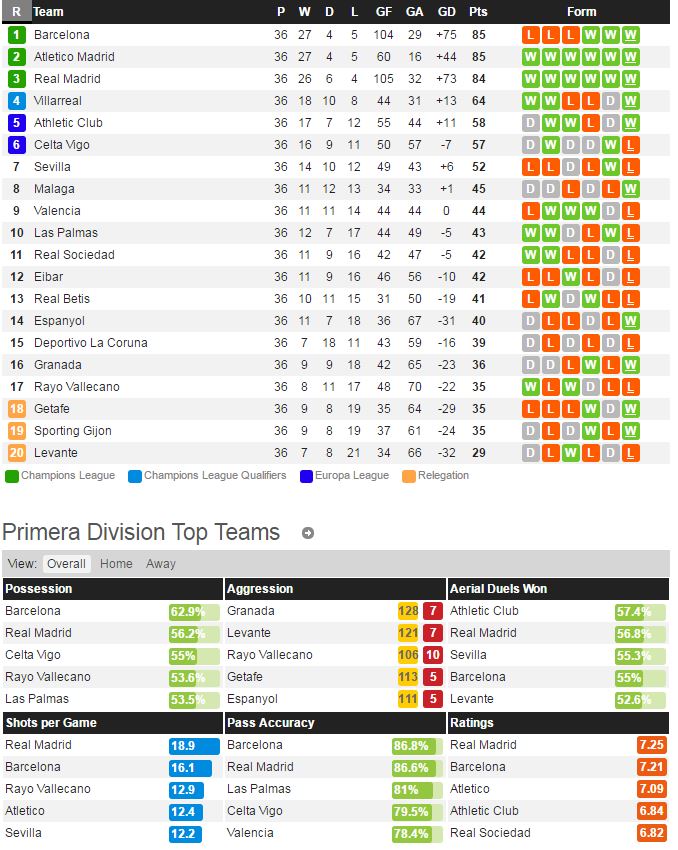 레반테는 지난 라운드 말라가전에서 1-3 패배를 당하면서 안타깝게 강등이 확정 되었다. 최근 홈에서는 나쁘지 않은 경기력 및 성적을 거두었지만 우승을 노리는 AT 마드리드를 상대하기엔 힘이 들것이다. AT 마드리드는 지난 라운드 바예카노전에서 1-0 승리를 거두고 주중 뮌헨과의 챔스 경기에서 1-2 패배 하였지만 결승에 진출 하였다. AT 마드리드의 선수들의 사기 및 컨디션은 최고조에 올라있지만 시메오네 감독이 벤치에 앉지 못하는 점이 변수가 될 수 있다.