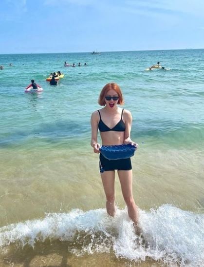 김새롬은 19일 인스타그램에 "나 또 바다, 쨍쨍 익는 오렌지"라며 해수욕장에서 물놀이를 즐기는 모습을 공개했다.