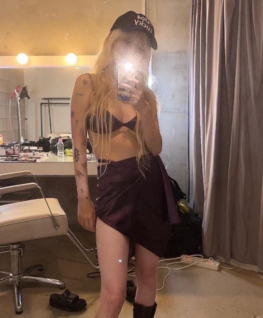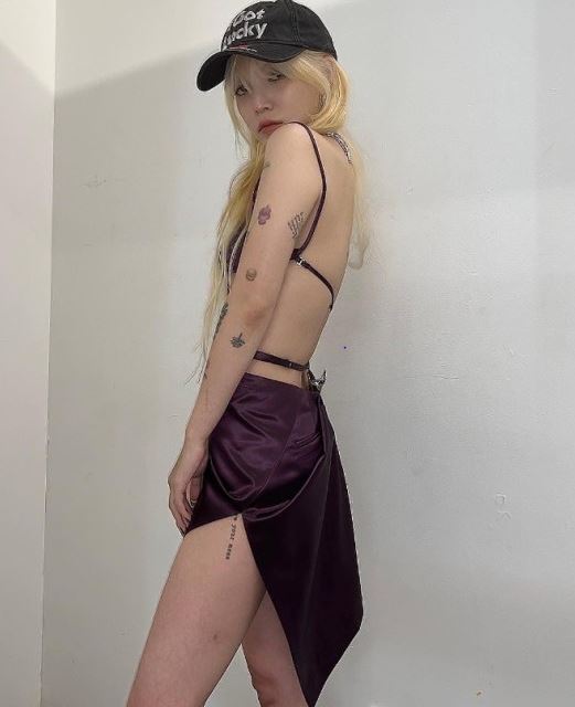 속옷같은 의상을 입은 지민은 글래머한 몸매를 자랑하고 있다. 특히 팔뚝에는 타투가 인상적이다.