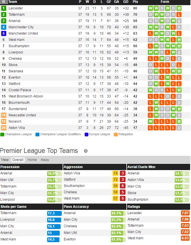 첼시는 지난 라운드 리버풀 전에서 1-1 무승부를 거두며 리그 9위에 머물러있다. 첼시는 이번 시즌 여러모로 실패한 시즌이기에 마지막 홈 경기에서 반드시 승리를 거두고 싶을 것이다. 레스터는 지난 라운드 에버턴 전에서 3-1 승리를 거두며 리그 우승 확정 이후에도 좋은 경기력을 보여주었다. 레스터는 이제 승점 보다는 팀내 득점 1위인 바디에게 득점왕 경쟁을 위해서 힘을 보태줄 것으로 보인다. 양팀 모두 평화로운 분위기 속에서 경기를 치를 것으로 보인다.
