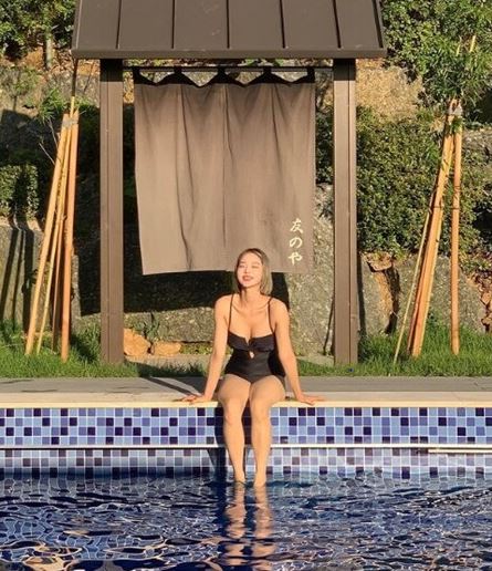 공개된 사진 속에는 검은색 비키니를 착용한 맹승지가 실외 풀장에서 물놀이를 즐기고 있는 모습이 담겼다. 특히 가슴 부분이 과감하게 절개된 수영복으로 드러난 맹승지의 글래머 몸매가 돋보인다.