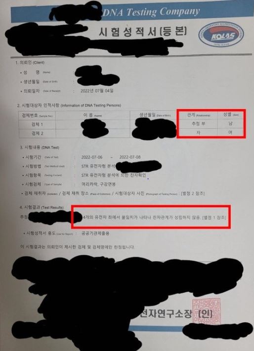 글에 따르면, A씨는 지난 6월 8일 아내가 남자와 모텔 들어가는 외도 현장을 잡고 현재 이혼 소송 중이다. 한 달여 뒤인 7월 4일, 딸에 대한 친자 검사를 의뢰한 A씨는 '4개의 유전자 좌에서 불일치가 나타나 친자 관계가 성립하지 않음'이라는 결과를 받았다.