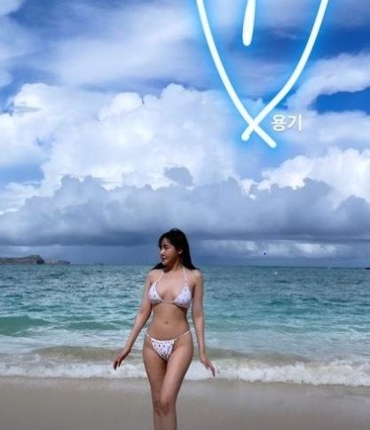 그는 개미허리에 반전 볼륨 몸매까지 자랑해 눈길을 끈다. 특히 그는 "용기"라는 단어도 함께 적어 비키니 자태를 공개하기까지 용기를 냈음을 암시했다.