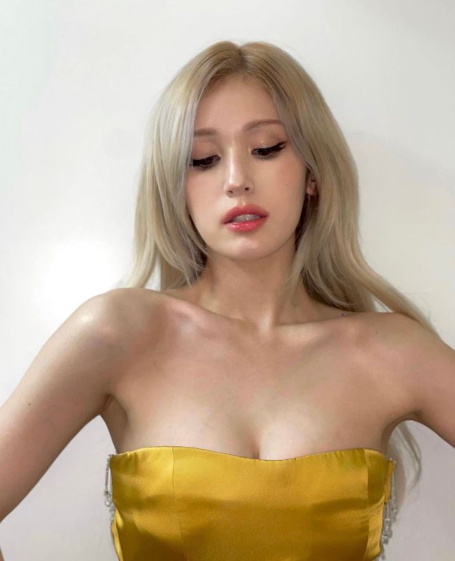 사진 속 전소미는 눈부신 황금빛 드레스를 입고 포즈를 취하고 있다. 튜브톱 디자인이라 전소미의 직각 어깨와 일자 쇄골을 마음껏 뽐낼 수 있었다.