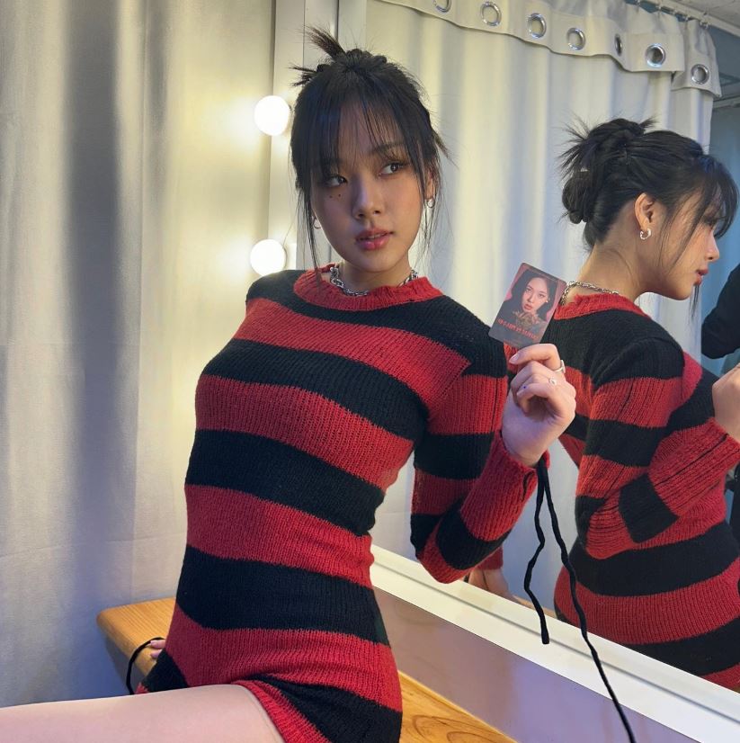 비비는 몸에 밀착되는 스트라이프 패턴 초미니 니트 원피스를 입고, 실버 액세서리를 더해 섹시하면서도 감각적인 패션을 선보였다.