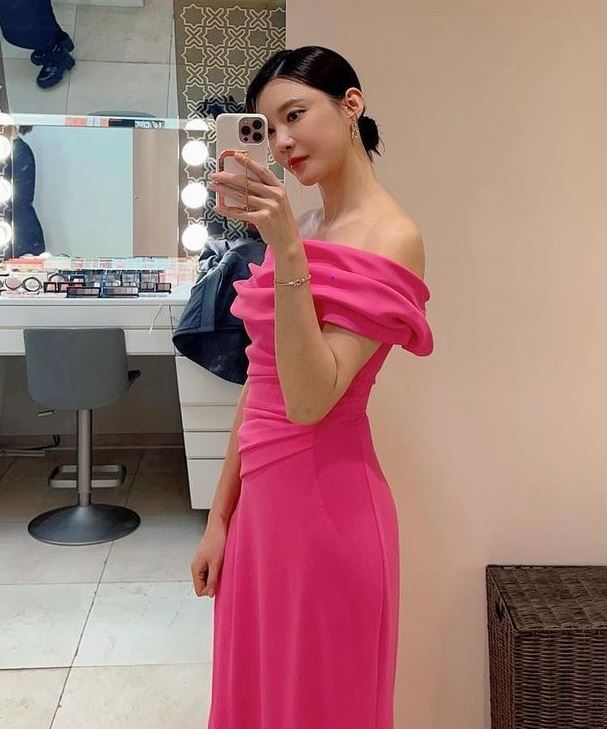 여기에는 핫핑크 색 오프숄더 드레스를 입고 거울 셀카를 찍고 있는 차예련의 모습이 담겨 있다. 이는
