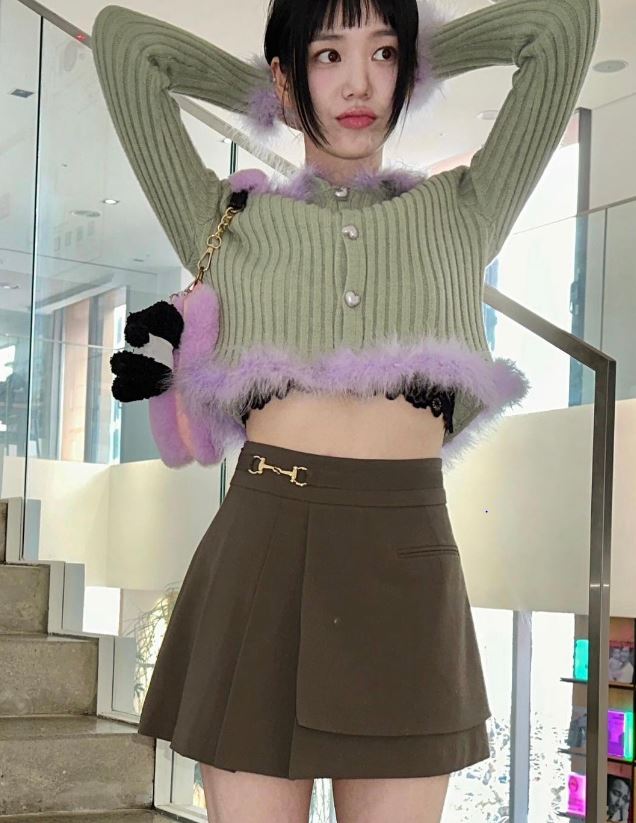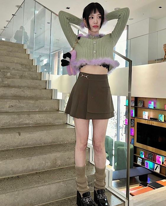 이유비는 최근 인스타그램에 이모티콘과 함께 두 장의 사진을 게재했다. 여기에는 크롭 카디건에 스쿨룩 느낌의 미니 스커트를 입은 이유비의 모습이 담겨 있다.