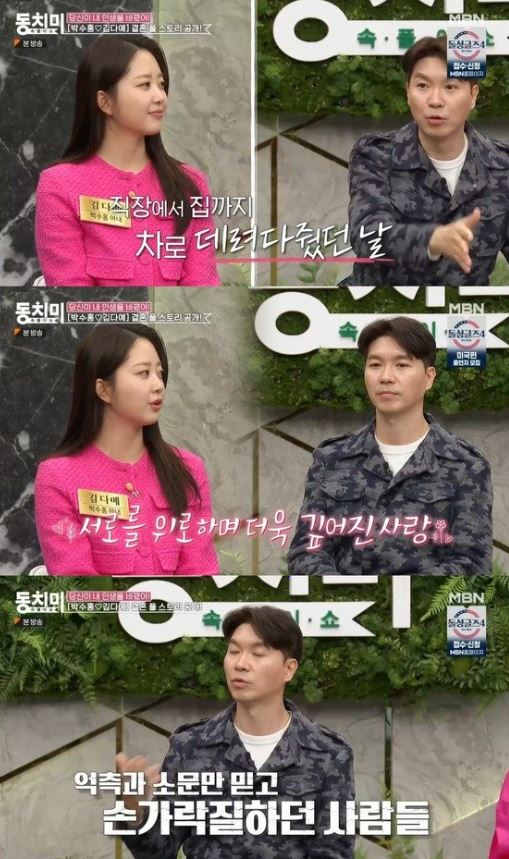 김다예는 "교제할 땐 결혼하겠다는 생각이 하나도 없었다. 오히려 이렇게 힘든 일을 겪고 나니 이런 사람이면 평생 함께해도 되겠다는 생각이 들었다"고 말했다. 박수홍은 "저는 제가 못되게 굴었다. 제 팔자에 결혼이 없는 줄 알았다. 결혼을 하면 잘못된다는 얘기를 자꾸 들으니 세뇌가 됐다. 내가 너무 좋아하면서도 결혼은 생각도 못 했다"고 얘기했다.