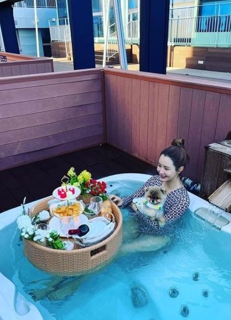이다해는 가슴 라인이 강조된 과감한 수영복을 입고 포즈를 취했다. 또 자쿠지 욕조에서는 반려견과 함께 물놀이를 즐겼다. 반려견의 귀여운 모습이 눈길을 끈다.
