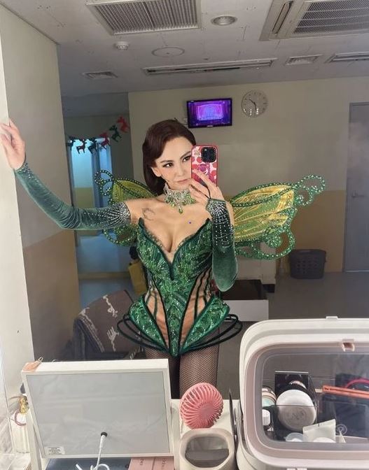 김지우는 최근 인스타그램에 "빨간 립스틱이 없으니 굉장히 허전해 보이는 Green Fairy"라는 글과 함께 사진을 공개했다. 여기에는 대기실에서 무대의상으로 갈아입고 요정으로 변신한 김지우가 담겼다.