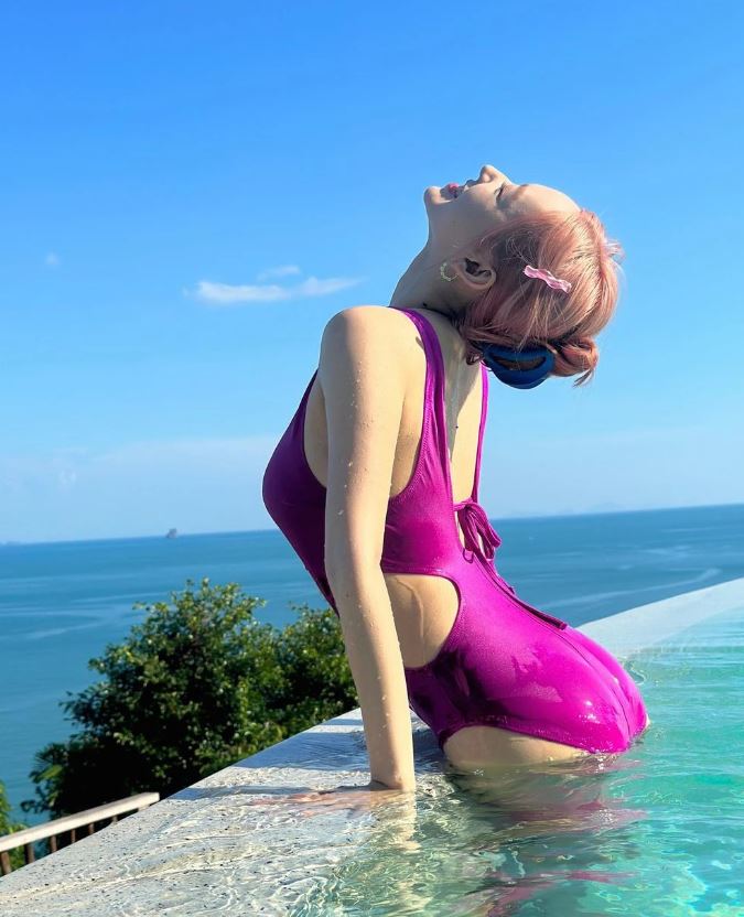 성소는 최근 인스타그램에 "TH"라는 글과 함께 사진 여러 장을 게재했다. 태국을 방문한 성소는 바다와 섬이 한눈에 보이는 수영장에서 과감한 포즈를 취하고 있다.