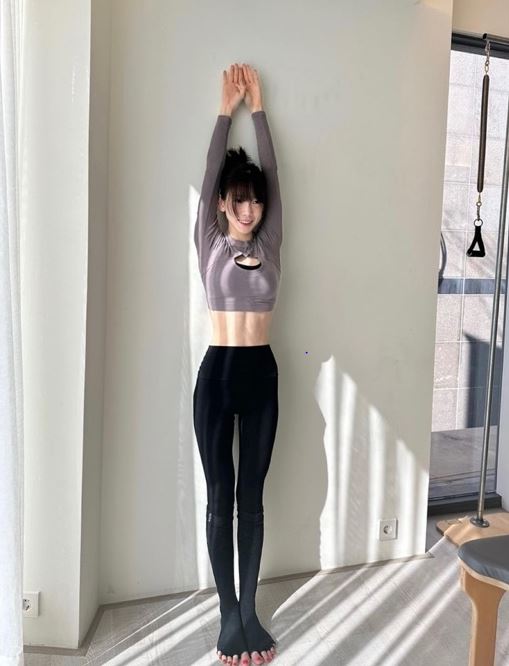 벽에 기대어 팔을 위로 쭉 뻗고 선 태연의 모습이 담겼다. 태연은 회색 크롭티에 검은색 레깅스를 입은 채 11자 복근을 뽐내며 탄탄한 몸매를 자랑하고 있다.