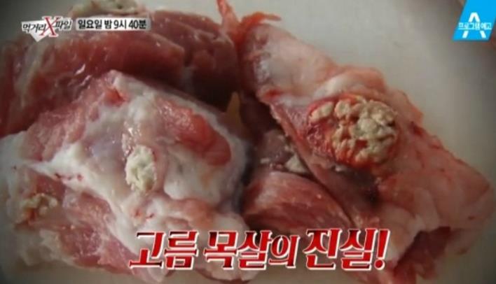 흰색 반점은 돼지고기 목살 부위에 주로 발생하는 것으로, 정체는 '고름'을 떼어낸 흔적이다. 더욱 심각한건 단순한 고름이 아닌 돼지에게 투여된 항생제가 몸속에서 엉켜 발생한 고름이라는 것.