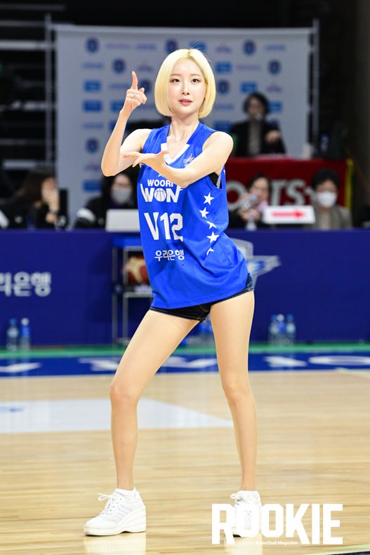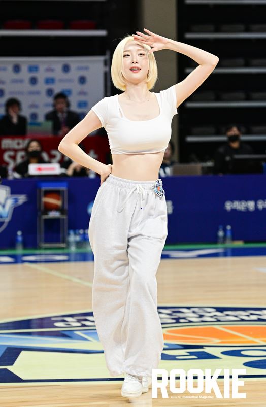 아산에 위치한 이순신빙상장체육관에서 ‘신한은행 SOL 2022~2023 여자프로농구’ 아산 우리은행과 부천 하나원큐의 경기가 열렸다. 서현숙 치어리더가 우리은행을 응원하고 있다.