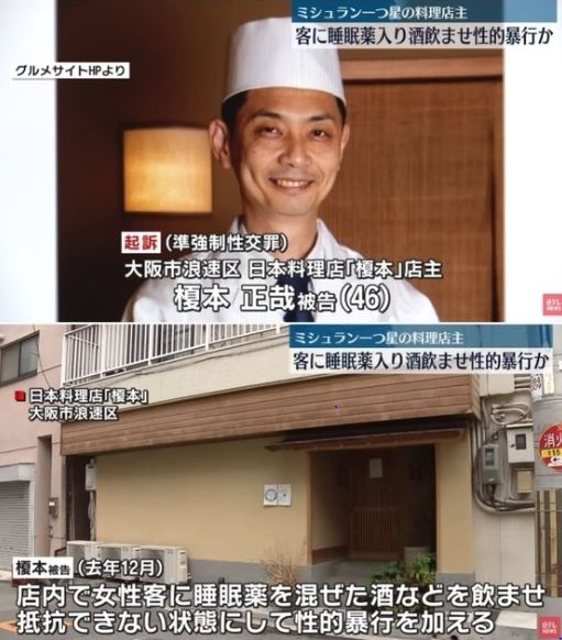 2일 테레비아사히 등 일본 언론에 따르면 오사카시 나니와구의 일식당 '에노모토'의 오너셰프 에노모토 마사야(47)가 지난해와 지지난해 두 차례에 걸쳐 여성 손님에게 수면제를 섞은 술을 마시게 한 후 저항할 수 없는 상태에서 여성들을 성폭행한 혐의로 징역 10년을 선고받았다.