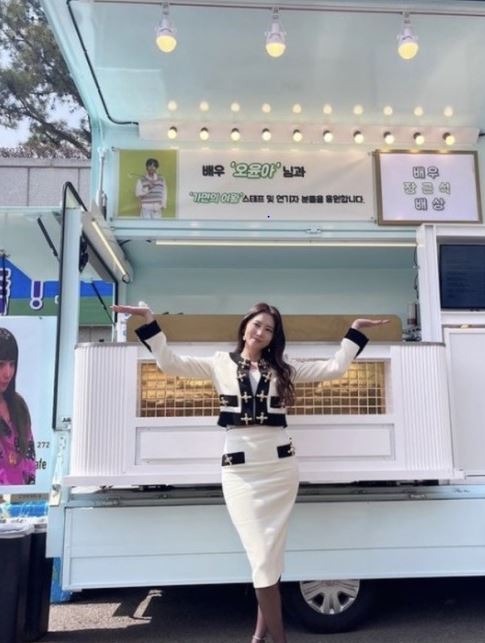공개된 사진 속에는 장근석이 보낸 커피차 앞에서 늘씬한 몸매를 자랑하고 있는 오윤아의 모습이 담겼다.