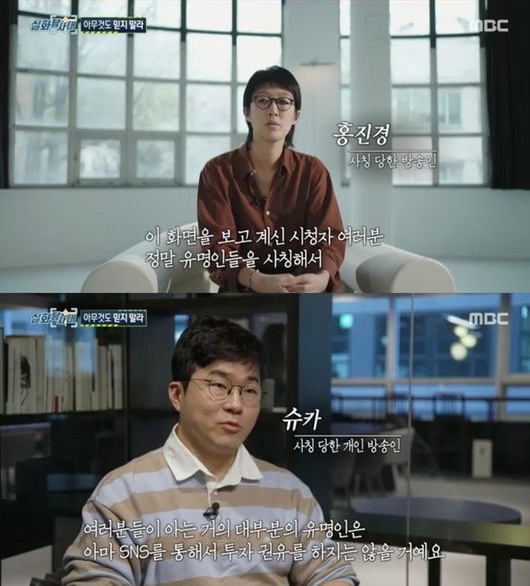 지난 25일 방송된 MBC ‘실화탐사대’에서는 유명인을 사칭한 사기 사건을 집중 조명했다. 이에 대해 홍진경과 슈카 등이 인터뷰에 응했다.
