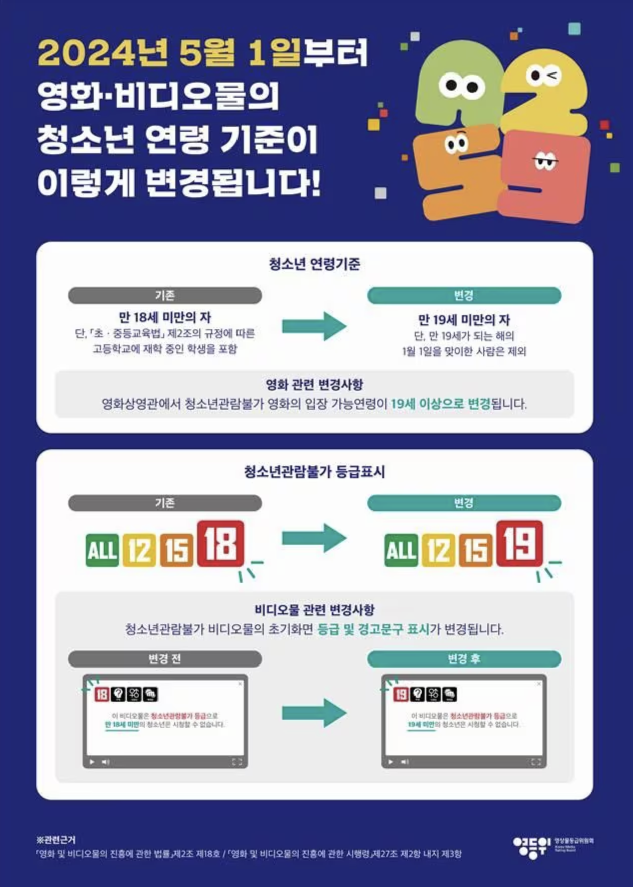 영상물등급위원회(이하 영등위)는 29일에 "멀티플렉스 3사(CGV, 롯데시네마, 메가박스) 및 OTT 플랫폼 사업자 등과의 협력을 통해 청소년관람불가 영화 관람 기준 변경에 대한 안내를 강화할 것"이라고 밝혔다.