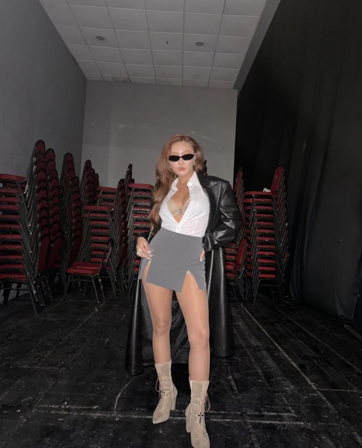 사진 속 화사는 선글라스를 쓰고 가죽 재킷을 입은 모습으로 포착됐다. 하얀 셔츠의 단추를 풀어 속옷이 살짝 드러나는 스타일이었다. 그녀의 풍만한 몸매와 섬세한 각선미가 눈길을 끌었다. 특히 화사는 입에 성냥을 물고 시크한 매력을 뽐내며 세련된 패션 감각을 과시했다.