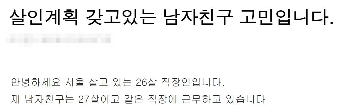 최근 한 온라인 커뮤니티에는 한 여성의 고민글이 화제가 되고 있다. 글쓴이는 자신은 26살 직장인이라고 밝히며 "살인계획을 갖고 있는 남자친구 고민입니다"라며 자신의 고민을 털어놓았다.