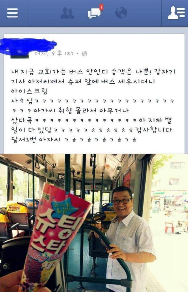그러나 이내 A씨의 얼굴엔 웃음꽃이 폈다. 나갔던 버스기사 A씨에게 '선물'을 건넸기 때문. 버스기사는 "아가씨 취향 몰라서 아무거나 샀다"며 A씨에게 시원한 아이스크림을 건넸다. 버스기사는 아이스크림을 사기 위해 버스를 세웠던 것이었다.