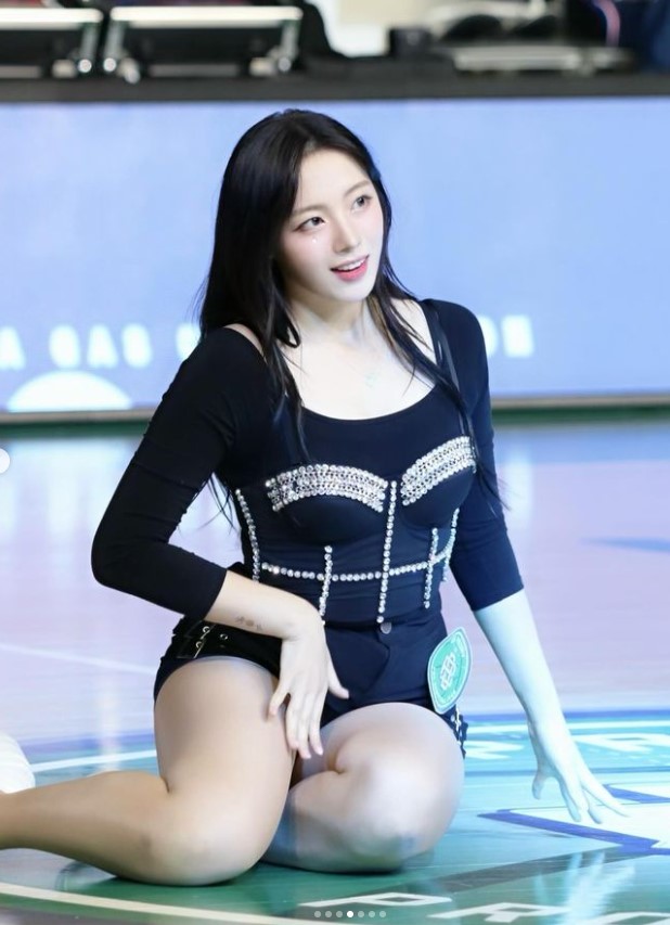 사진 속 하지원 치어리더는 프로농구 원주 DB 프로미의 치어리더로 코트 위에서 열정적인 응원전을 펼치고 있다.