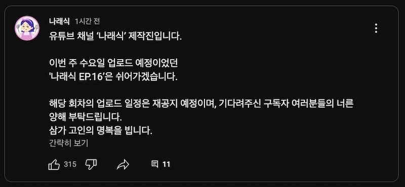 31일 박나래의 유튜브 채널 커뮤니티에는 “이번 주 수요일 업로드 예정이었던 ‘나래식’ EP.16은 쉬어가겠습니다”라는 공지가 올라왔다. 이어 “해당 회차의 업로드 일정은 추후 재공지될 예정이며, 기다려주신 구독자 여러분들의 양해를 부탁드립니다. 삼가 고인의 명복을 빕니다”라고 덧붙이며 깊은 애도를 표했다.