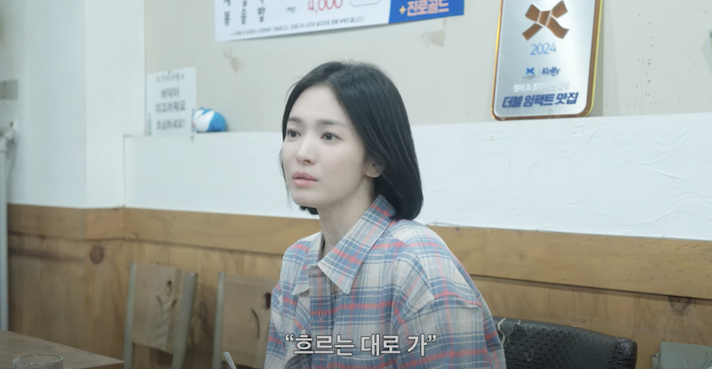 강민경이 송혜교에게 "딱 보면 쭉 간 것처럼 보인다"고 하자, 송혜교는 "나름 많은 일이 있었다"며 "항상 좋은 쪽으로 생각하려 한다"고 밝혔다. 이어 "이미 터졌으면 지나간 일로 생각하고 빨리 잊으려 한다"고 덧붙였다. 또한 송혜교는 어릴 때 어머니에게 들었던 조언을 전하며, "흘러가는 대로 냅두라. 상황이 나쁘게 가더라도 이미 지나간 일이니 신경 쓰지 말라"는 말을 기억한다고 했다.