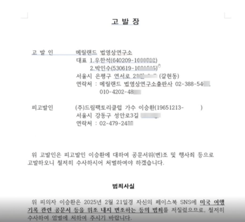 이번 고발은 메릴랜드 법영상연구소 측이 제기했으며, 고발장에서는 "2025년 2월 21일경, 이승환이 자신의 SNS에 미국 여행 기록과 관련된 공문서를 위조하거나 변조한 범죄를 저질렀다"고 주장했다. 이들은 이에 대해 철저한 수사를 요청하며, 이승환에게 엄벌을 내릴 것을 촉구했다.