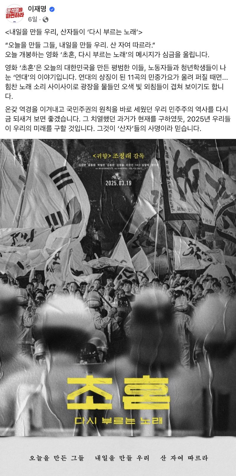 이 대표는 "우리는 민주주의 역사를 되새기며, 그 치열했던 과거가 현재를 구하였듯 2025년 우리의 미래를 구할 것"이라고 덧붙이며, "그것이 '산자'들의 사명이라 믿는다"고 전했다.