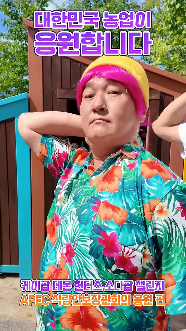 농식품부는 오는 9~10일 인천에서 열리는 아시아태평양경제협력체(APEC) 식량안보 장관회의를 앞두고, 5일 공식 유튜브 채널에 ‘소다팝 챌린지’를 패러디한 홍보 영상을 공개했다. 영상에는 케데헌 속 가상 보이그룹 ‘사자 보이즈’의 멤버 ‘애비’로 분장한 전한영 대변인이 등장해 춤을 추며 회의 개최를 알린다.
