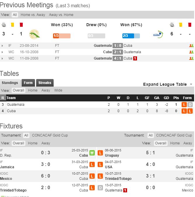 쿠바는 2패로 3위 와일드카드를 노린다. 1무1패의 과테말라도 최대한 승점을 쌓으려는 동기부여가 강하다. 과테말라는 지난 경기 멕시코와 비기는 저력을 드러냈다. 단 이번 대회 직전 A매치까지 포함해 전방의 결정력이 떨어지는데 35살의 베테랑, A매치 116경기에 출장한 FW C.루이스(무니시팔)의 한방이 절실하다. DF 콘트레라스가 지난 경기 퇴장으로 제외되는 부담이 있다. 쿠바는 멕시코전 0-6, 트리니다드토바고전 0-2로 패했다. 창은 무디고 수비 전열도 시스템화되지 못했다.