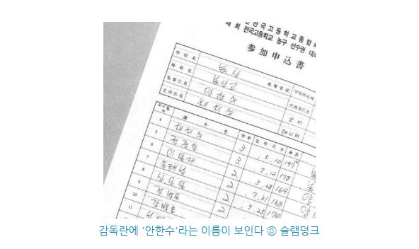 슬램덩크에 등장하는 모든 캐릭터들은 이름을 가지고 있다. 일본 원작이기 때문에 일본 이름을 가지고 있으며 한국 이름도 함께 가지고 있다. 슬램덩크의 주인공 팀 '북산 고교'의 감독 '안선생님'도 마찬가지.
