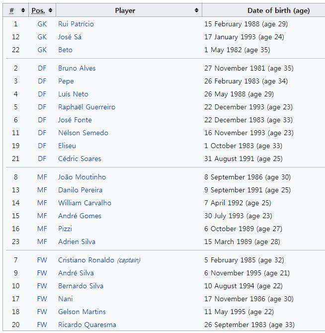 유로2016 챔피언 포르투갈은 최정예 멤버를 꾸렸다. 직전 평가전에서도 키프러스를 4-0, 라트비아를 3-0으로 격파했다. 최근 A매치 7경기서 6승1패를 기록 중. FW 호날두(레알), B.실바(맨시티), 나니(발렌시아), 콰레스마(베식타스) MF 무티뉴(모나코) DF 페페(레알) 등 베테랑이 모두 소집됐다. 지난 유로서 반짝 활약했던 MF R.산체스(뮌헨)는 이번 명단에 이름을 올리지 않았다.
