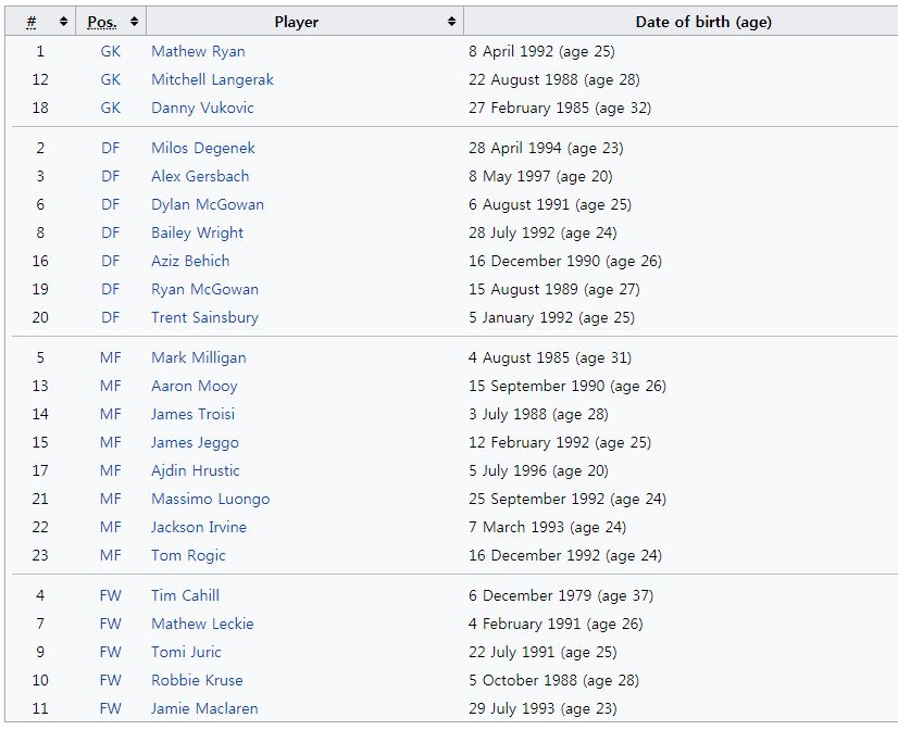 호주는 아시안컵 우승 자격으로 출전한다. 여전히 호주에는 FW 케이힐(멜버른) 레키(베를린) MF 예디낙(애스턴빌라) 등 베테랑이 중요한 전력을 차지하고 있다. 단 A매치 97경기를 뛴 팀의 기둥 케이힐은 지난 8일 사우디와 월드컵 최종예선 선발 명단에서 빠졌다. 대신 원톱으로 출격한 FW 유리치(루체른)이 2골을 터뜨리며 팀 공격을 리딩했다. 이후 브라질과 평가전에선 0-4로 대패했다.
