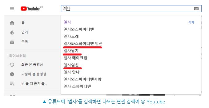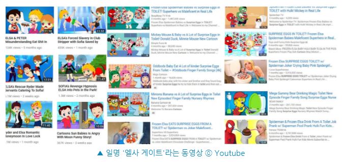 실제로 유튜브에 '엘사'를 검색하면 연관검색어로 '엘사 납치', '엘사 임신'등이 떠 이러한 영상을 접하는 이가 많다는 것을 확인할 수 있었다.